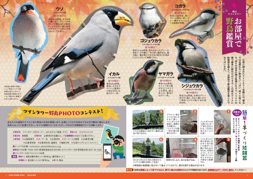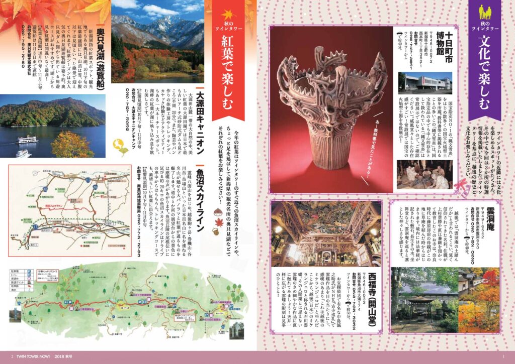 新たな越後楽しみ発見を! P1-2 秋のツインタワー文化で楽しむ、紅葉で楽しむ P3-4 南魚沼グルメ決戦 新蕎麦VS魚沼産新米(我が家の卵/こめ太郎/おにぎりや/坂戸城/長森/田畑屋/上田の郷/ごんげん) P5-6 お部屋で野鳥鑑賞 |