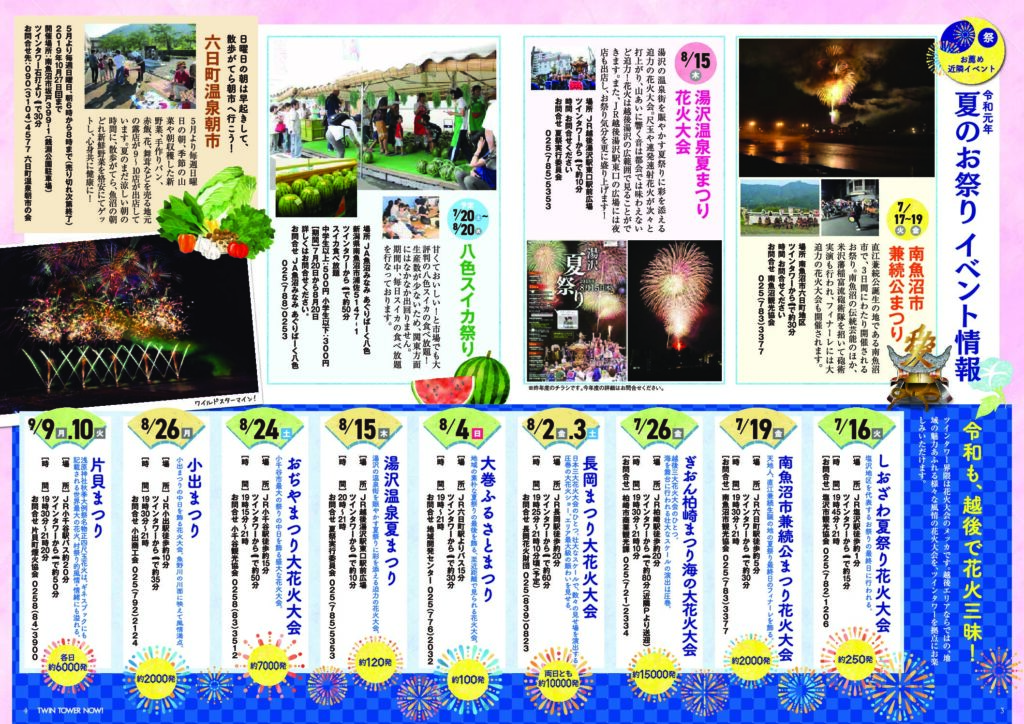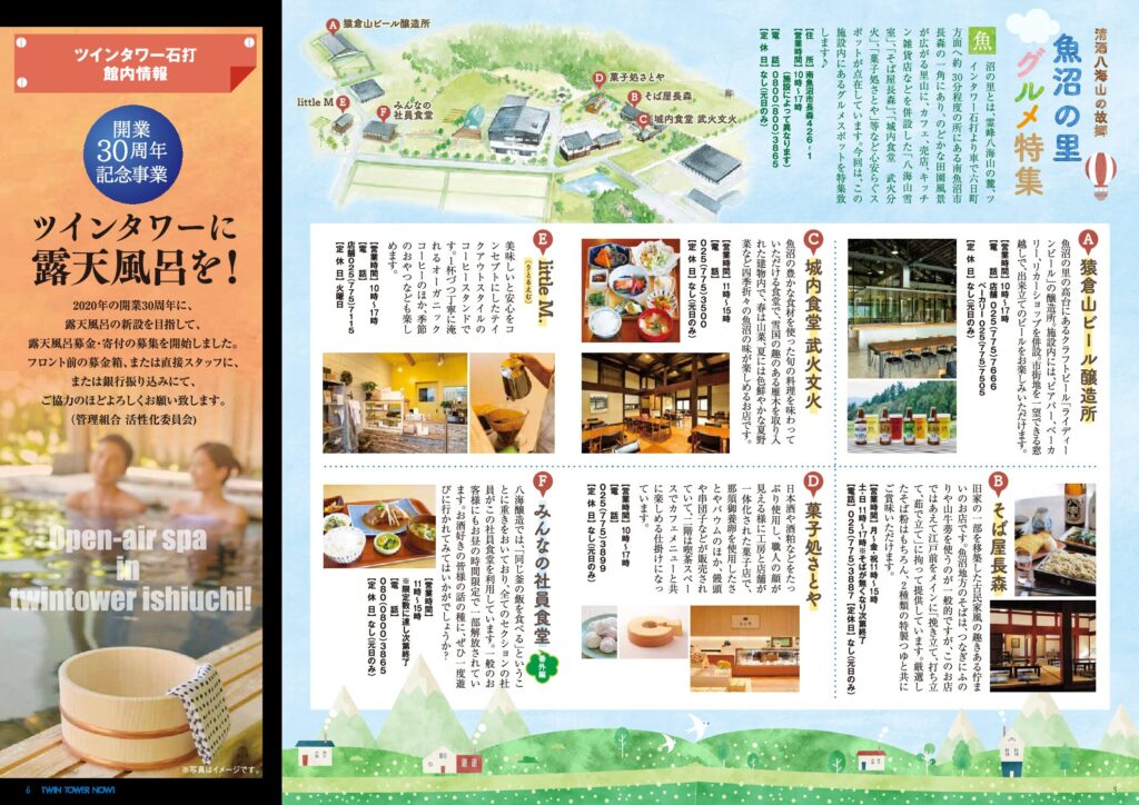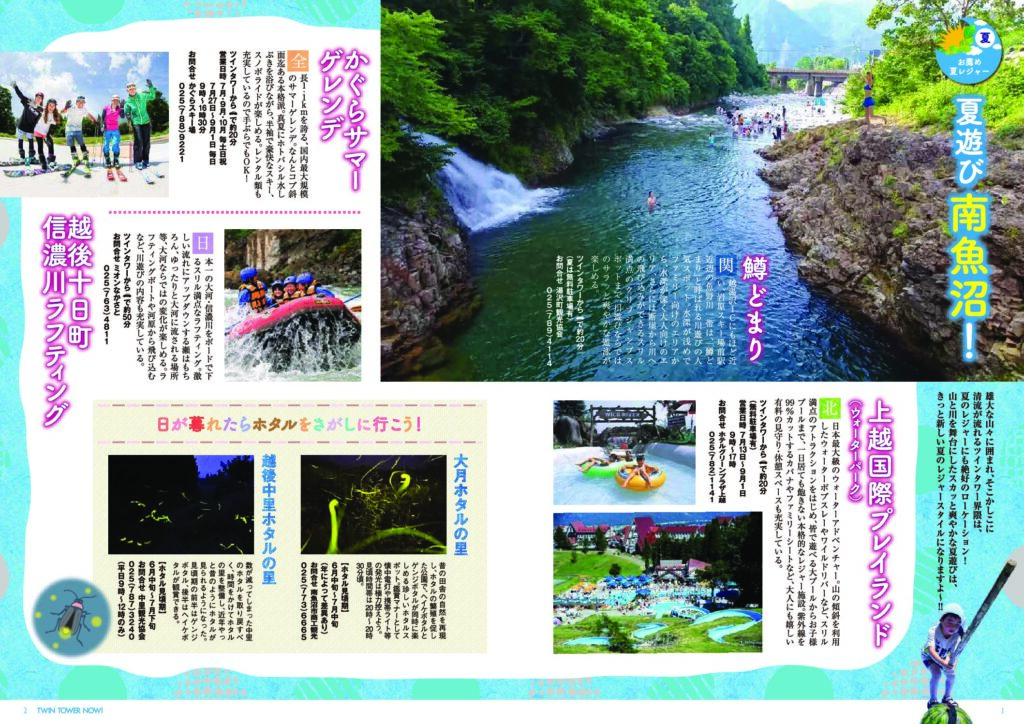 夏の越後にレジャーへGO! p1−2 お薦め夏レジャー 夏遊び南魚沼! P3-4 お薦め近隣イベント 令和元年夏のお祭りイベント情報 P5-6 清酒八海山の故郷 魚沼の里グルメ特集(猿倉山ビール醸造所/そば屋長森/城内食堂武火文火/菓子処さとや/little M/みんなの社員食堂) 館内情報 ツインタワーに露天風呂を! |