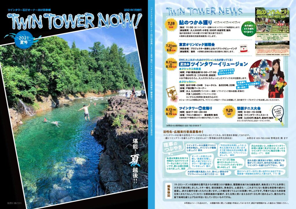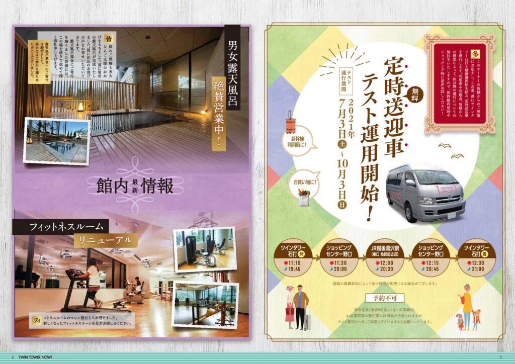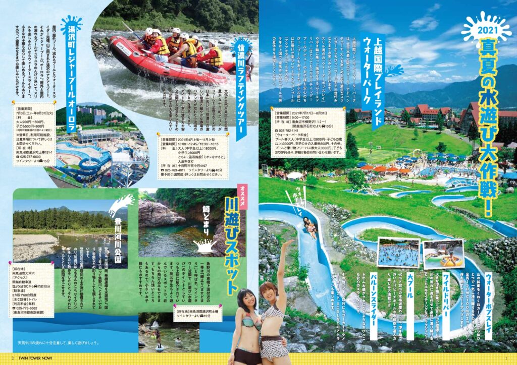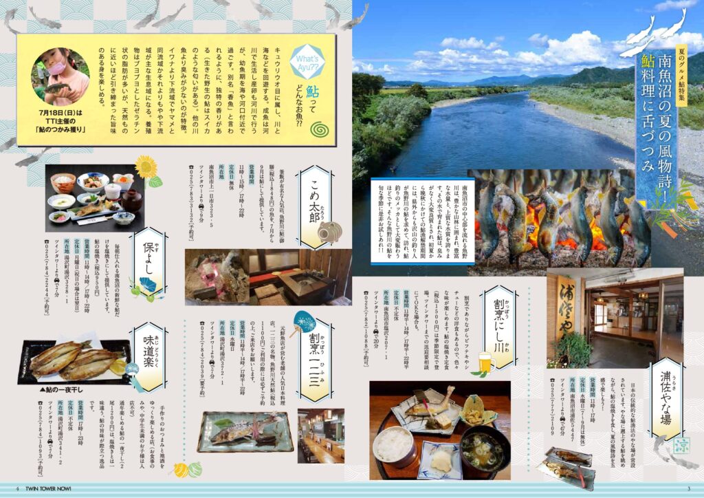 堪能!夏越後!! P1-2 2021真夏の水遊び大作戦! P3-4 夏のグルメ鮎特集 南魚沼の夏の風物詩!鮎料理に舌つづみ(浦佐やな場/割烹にし川/こめ太郎/割烹一二三/保よし/味道楽) P5-6 館内最新情報 定時送迎車テスト運用開始 露天風呂 フィットネスルームリニューアル