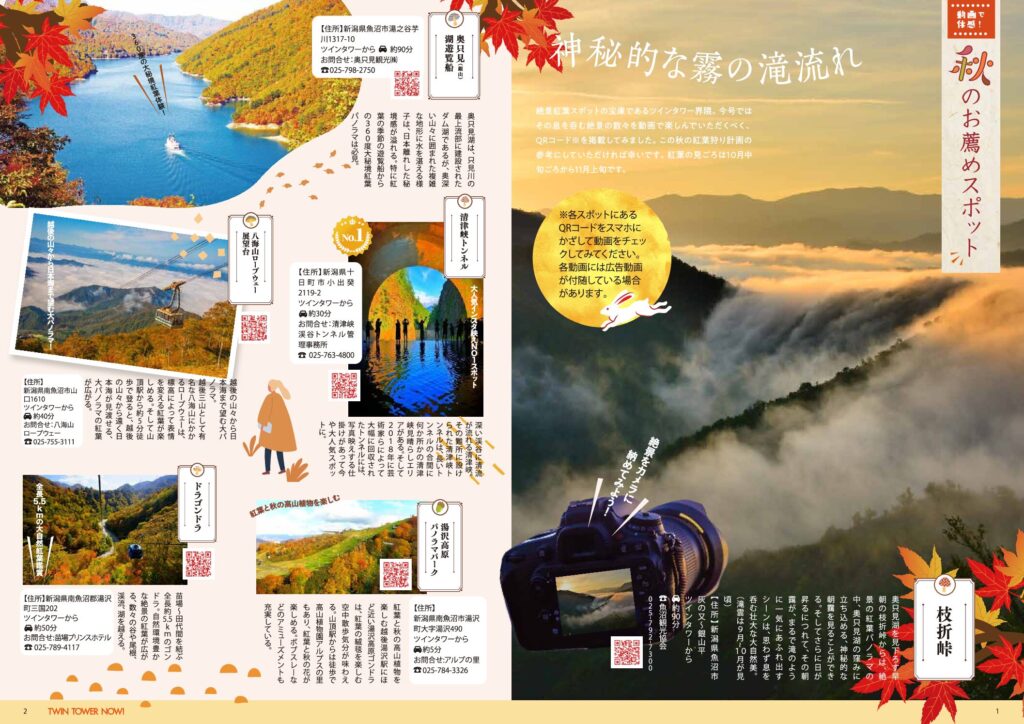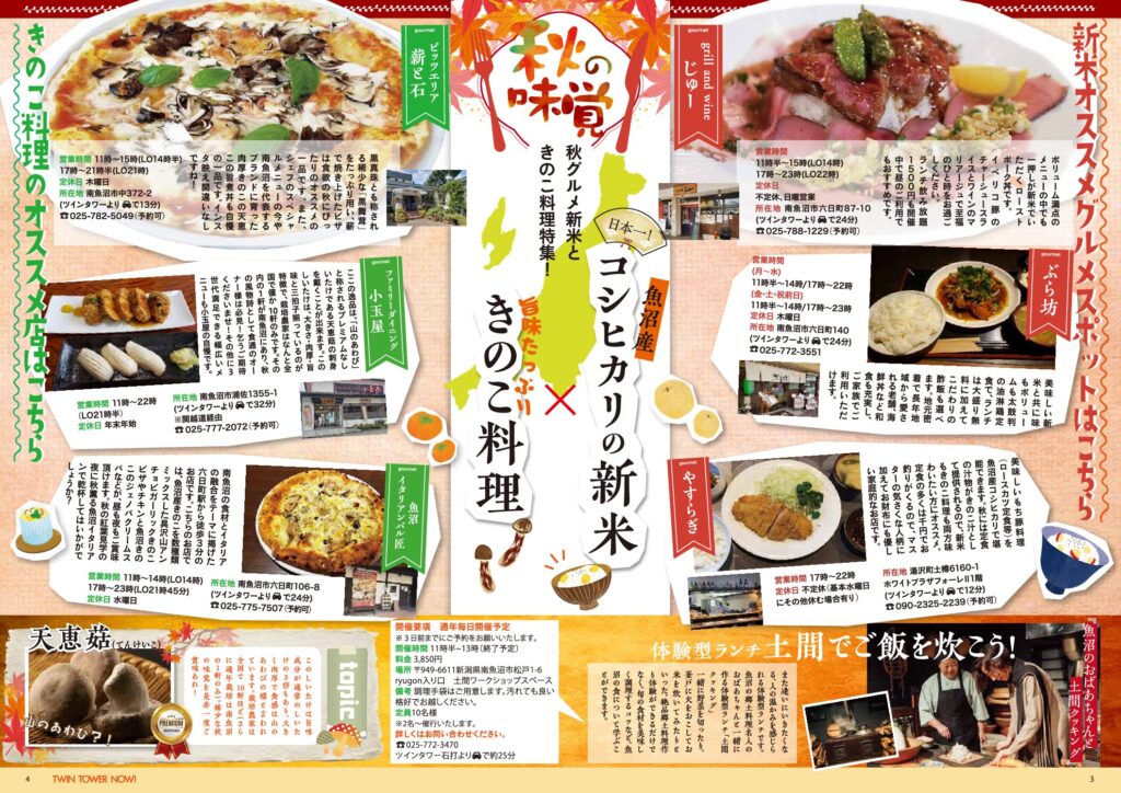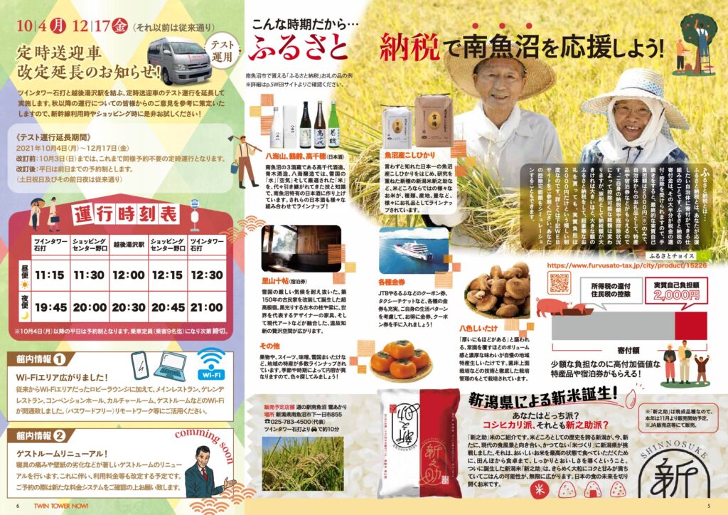 隠れた見どころも満載!まだまだ楽しむ越後の秋 P1-2 動画で体感!秋のお薦めスポット P3-4 秋の味覚 秋グルメ新米ときのこ料理特集日本一魚沼産コシヒカリ(grill and wine じゅー/ぶら坊/やすらぎ/)×旨味たっぷりきのこ料理(ピッツエリア薪と石/小玉屋/魚沼イタリアンバル匠) P5-6 ふるさと納税で南魚沼を応援しよう! 定時送迎車改定延長のお知らせ! |