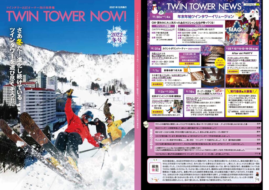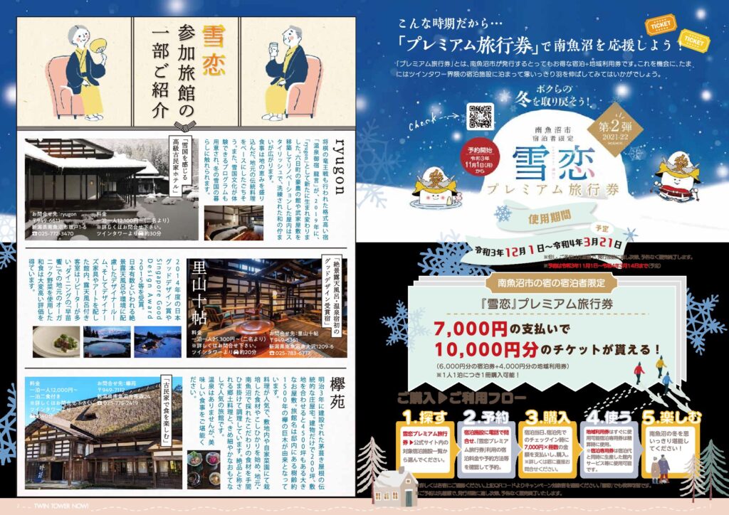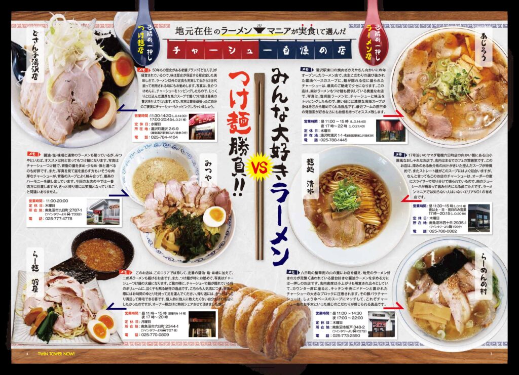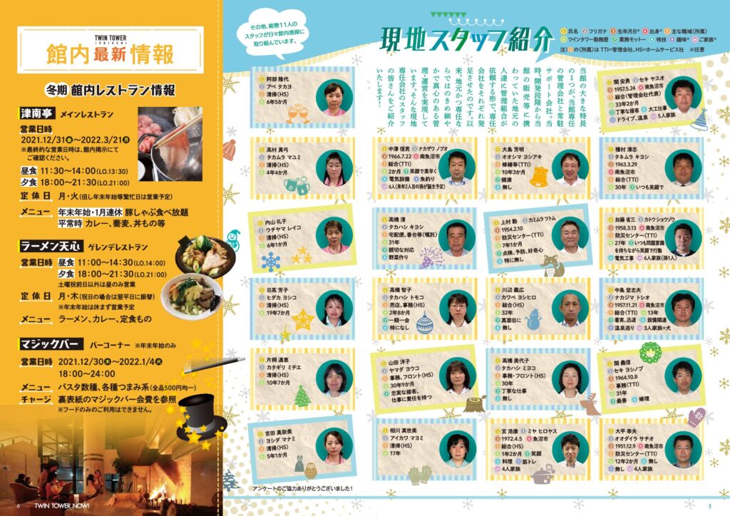 さあ冬だ!進化し続けているツインタワーを遊び尽くそう!! P1-2 こんな時期だから…プレミアム旅行券で南魚沼を応援しよう! P3-4 みんな大好きラーメン(あじろう/麺処 清水/らーめんの村/)VSつけ麺勝負!!(どさん子湯沢店/みつや/らー麺 羽屋) P5-6 現地スタッフ紹介 館内最新情報 |
